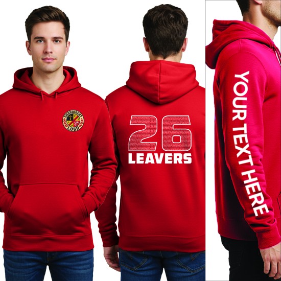 Leavers Personalised Custom Hoodie – Front Embroidered School Logo, "Leavers" Design & Customised "26" in Bold Block-Style Numbers with Student Names in Paragraph-Style Font on the Back and Customised Vertical Sleeve Text