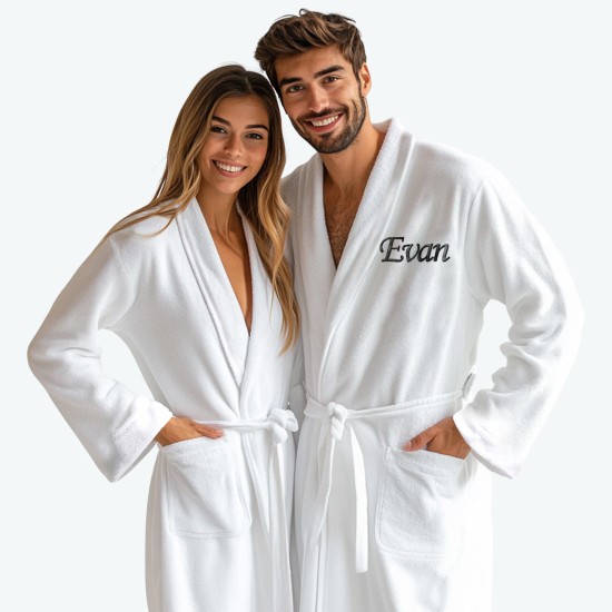 Buy this luxury terry towel bathrobe with back name and curly elegant Embroidery ideal for mens bathrobe. This is a crown design which you can get embroidery of your name  personalised on the back of the terry gown. These luxury terry robes with back crown and custom text embroidery will make a great gift item.  Its a full length robe which we are offering in 2 sizes from stock. This is ideal to wear for home use or for bridal night wear. It’s comfortable to wear and with its 2 deep pockets make it a perfect choice for any individual.