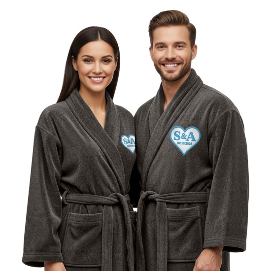 Show love and style with our Personalised Heart Monogram Bathrobe, made from 450 GSM 100 % Terry Cotton for a soft, cosy, and absorbent feel. Each robe features a beautiful embroidered heart design with your initials and date, creating the perfect keepsake for couples.