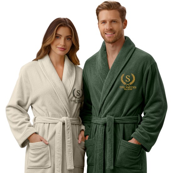Wrap yourself in everyday luxury with our Personalised Laurel Wreath Bathrobe, a beautifully custom embroidered bathrobe made from 450 GSM 100% Terry Cotton. This robe combines premium softness, warmth, and absorbency — giving you that spa-quality comfort at home after every bath or shower.