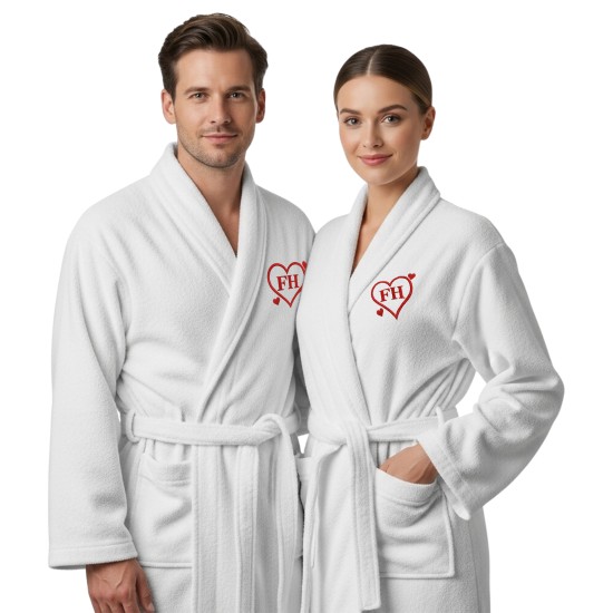Each robe is custom embroidered with your initials inside a heart monogram design, using our elegant engraved-style font. Whether it’s for you and your partner or a thoughtful gift for a wedding or anniversary, this robe blends luxury, comfort, and personal style beautifully.