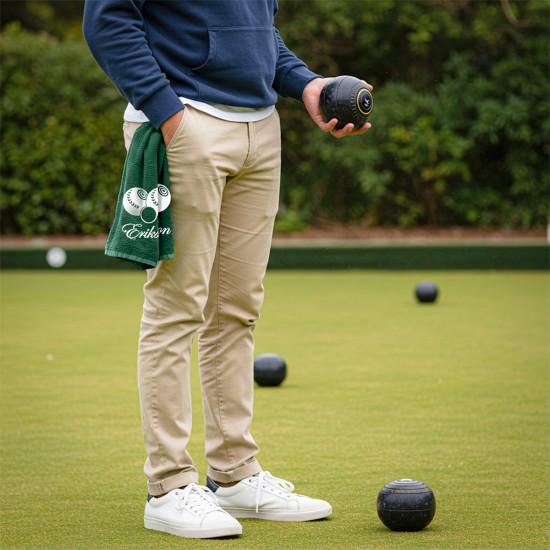 Add a touch of style and precision to your game with this Personalised Lawn Bowls Towel, a personalised embroidered towel crafted especially for bowling enthusiasts. Designed with a sleek lawn bowls embroidery motif, it’s the perfect way to keep your hands and bowls dry while showing off your individuality.