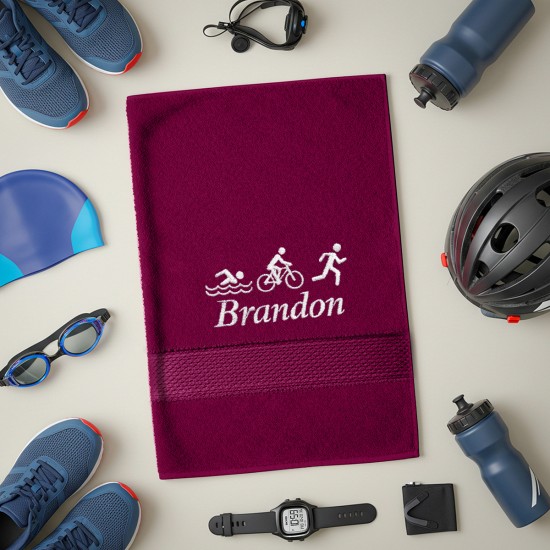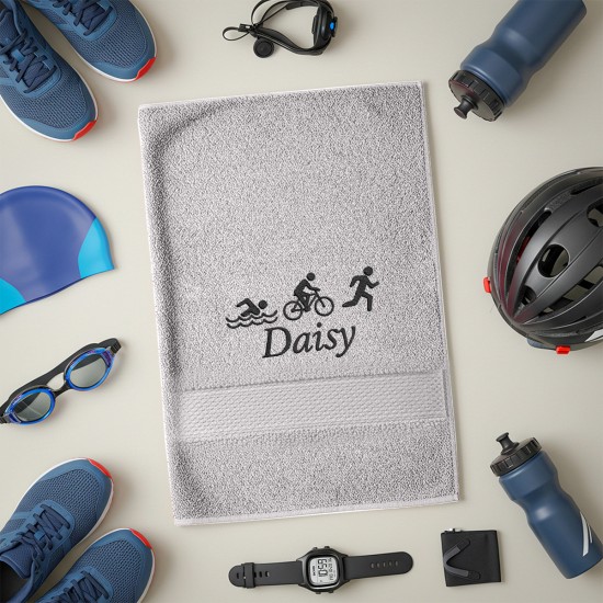 Personalised Embroidered Triathlon Design Towel – Customised Name – Swim, Bike & Run Enthusiasts Sports Towel Gift for Triathletes - Hand Size Towel - 50 x 90 cm